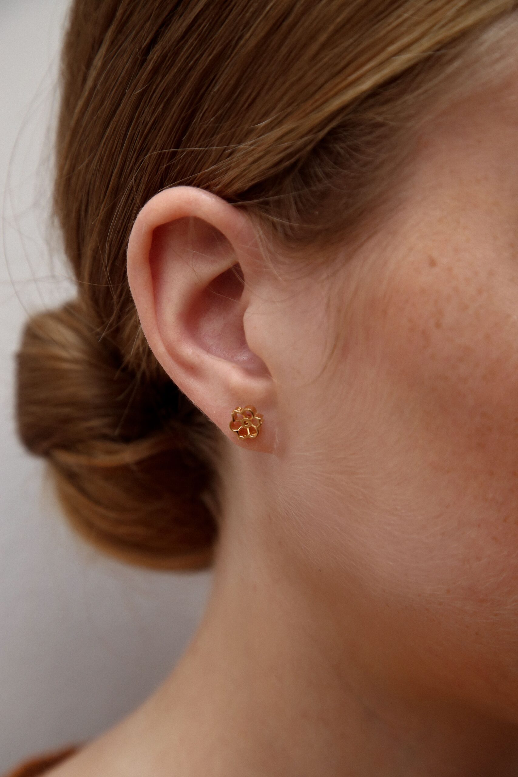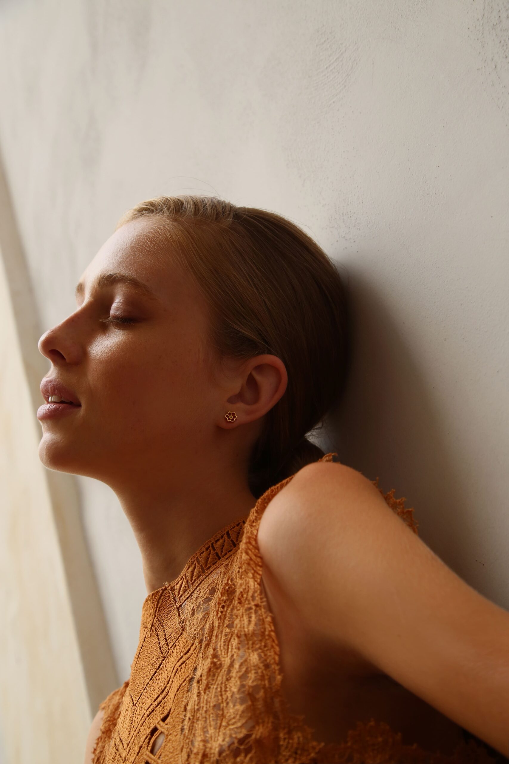 Simili a piccoli fiori primaverili o a stelle in un cielo d’estate, questi micro orecchini rappresentano in realtà la pianta a sette punte della chiesa di Sant’Ivo alla Sapienza progettata da Francesco Borromini. Un omaggio al fascino leggero del barocco romano, e alla sua bellezza contemporanea.