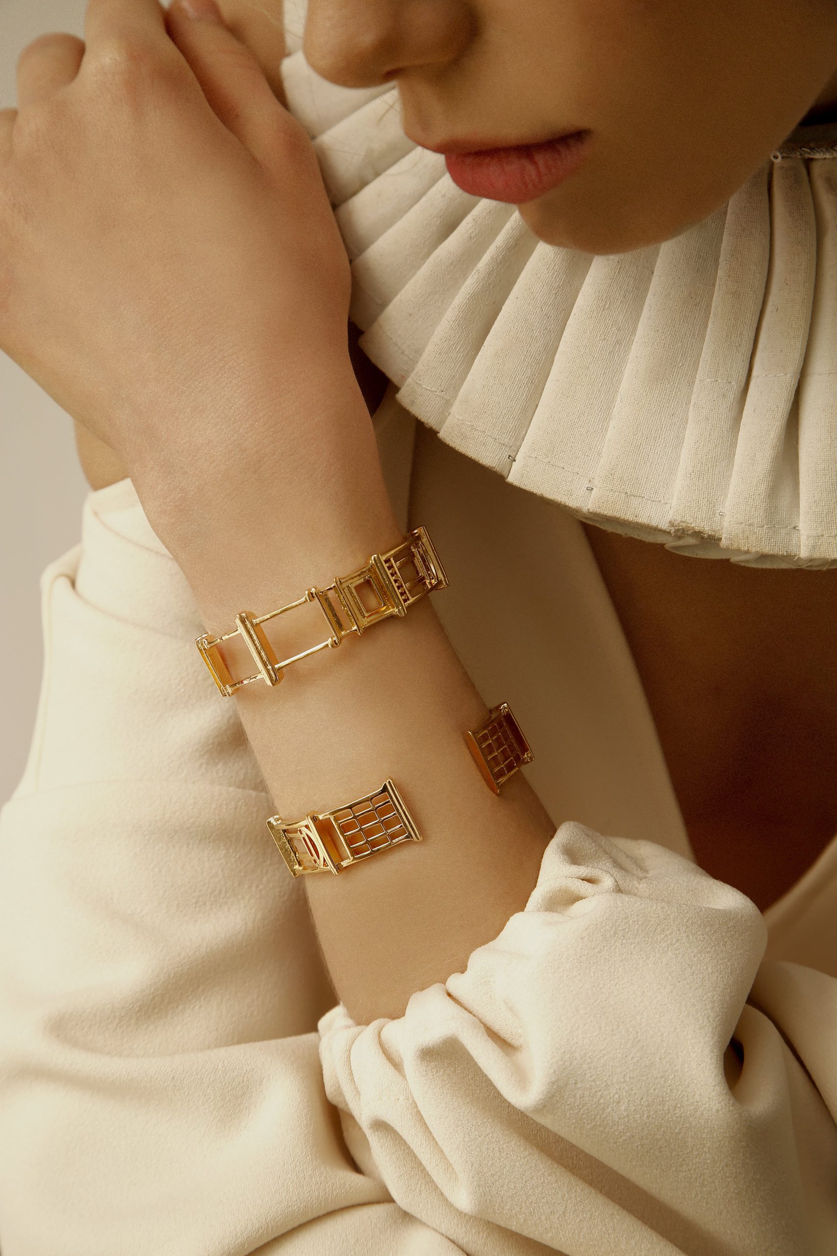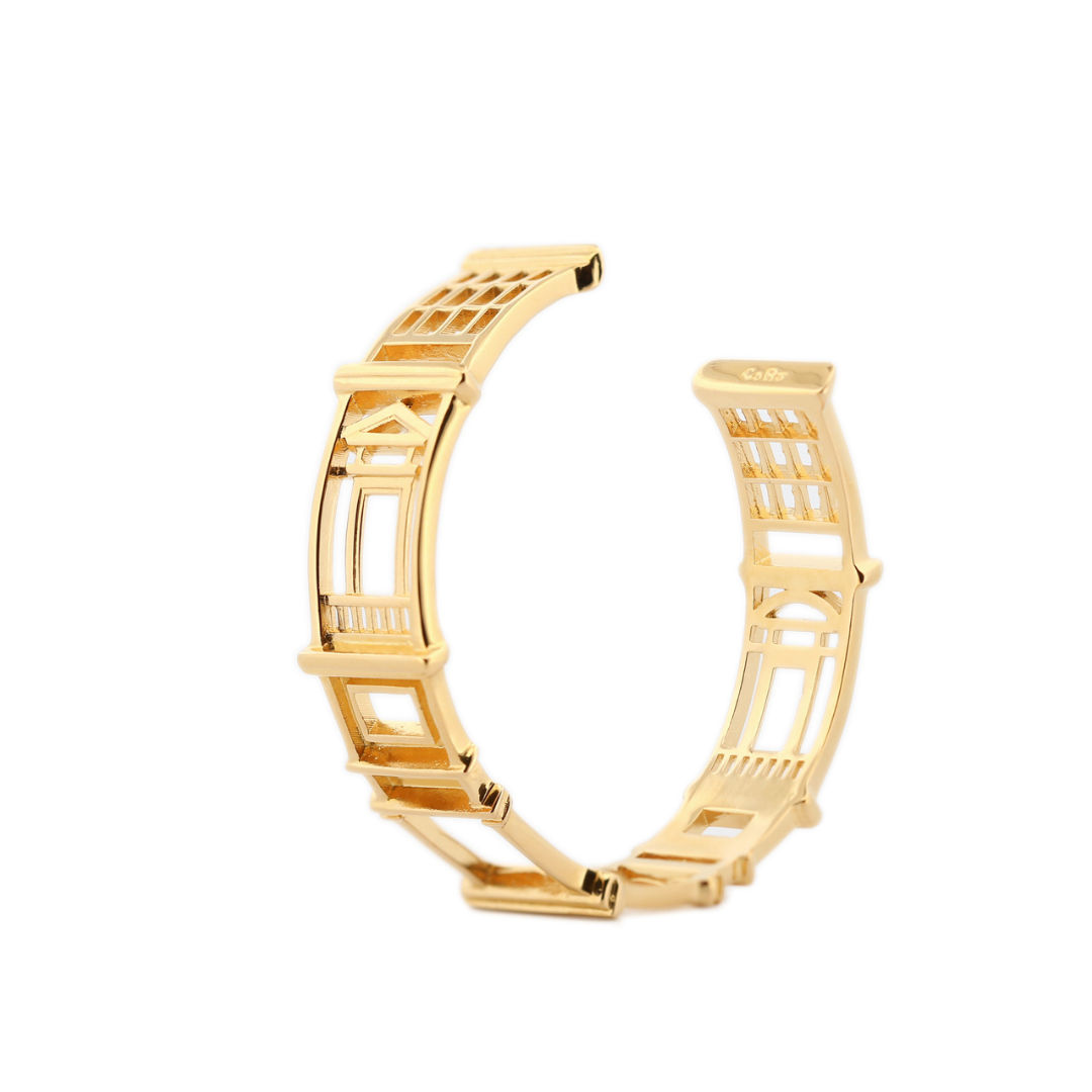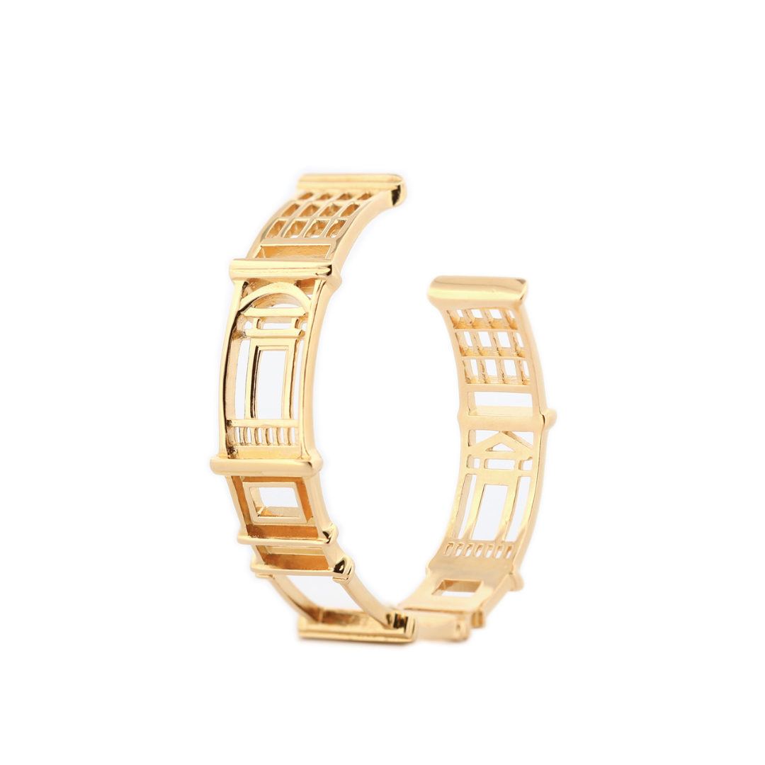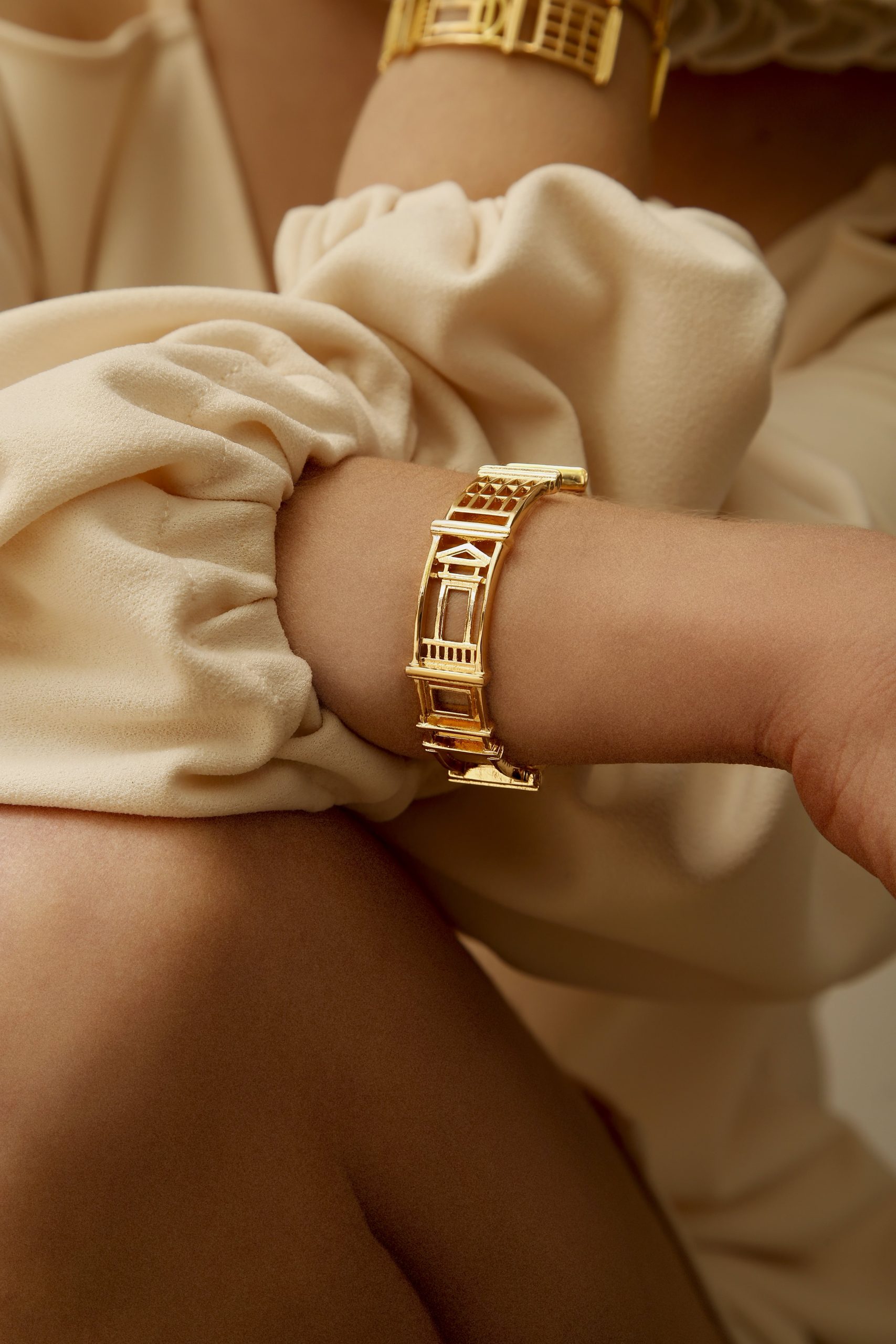 Emblema di una monumentalità gioiosa e leggera, la Galleria degli Uffizi è ritratta nel suo vortice meraviglioso di finestre, porticati e vetrate in questo bracciale dallo spirito contemporaneo – come passeggiare a Firenze in una giornata di sole.