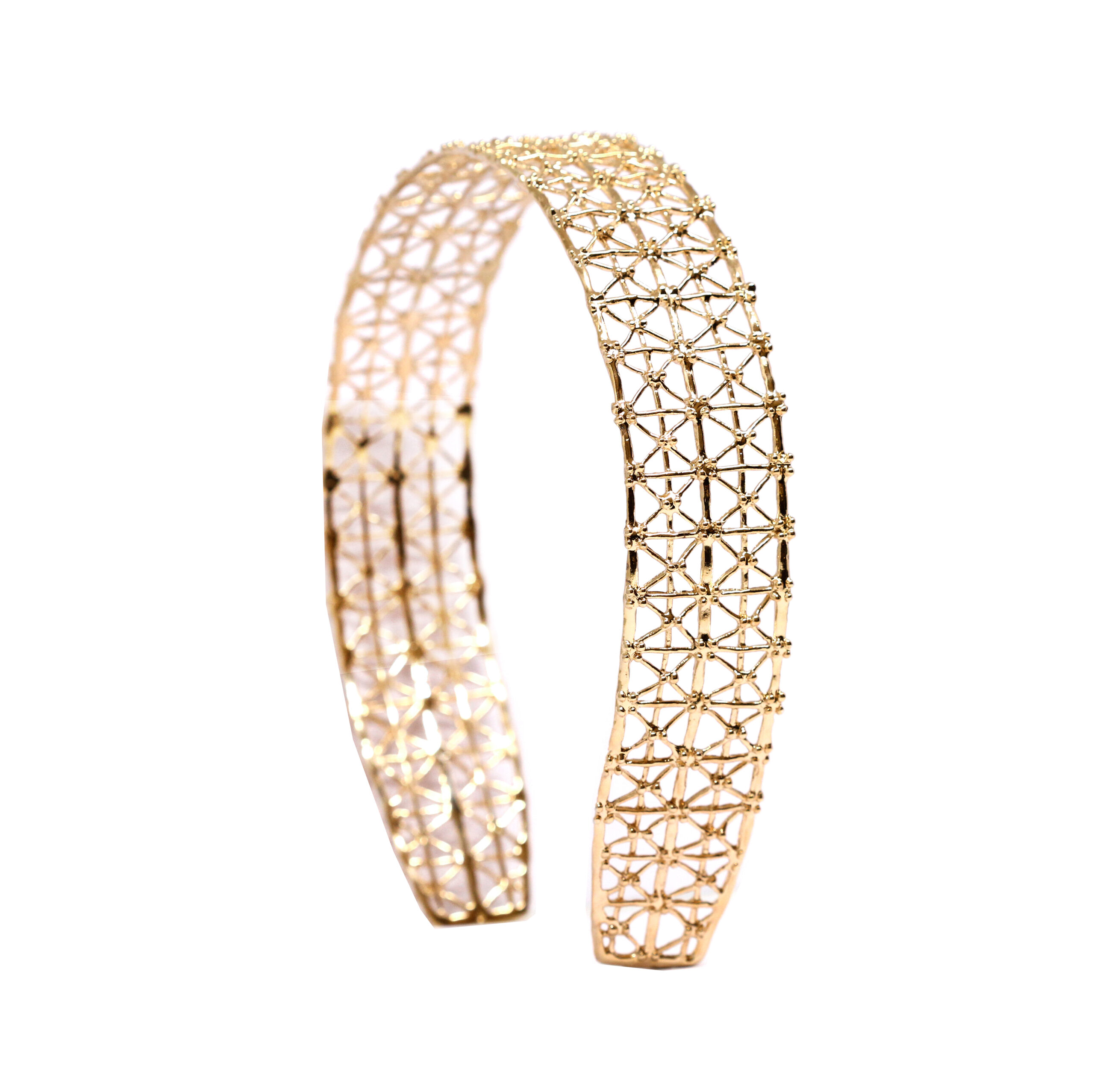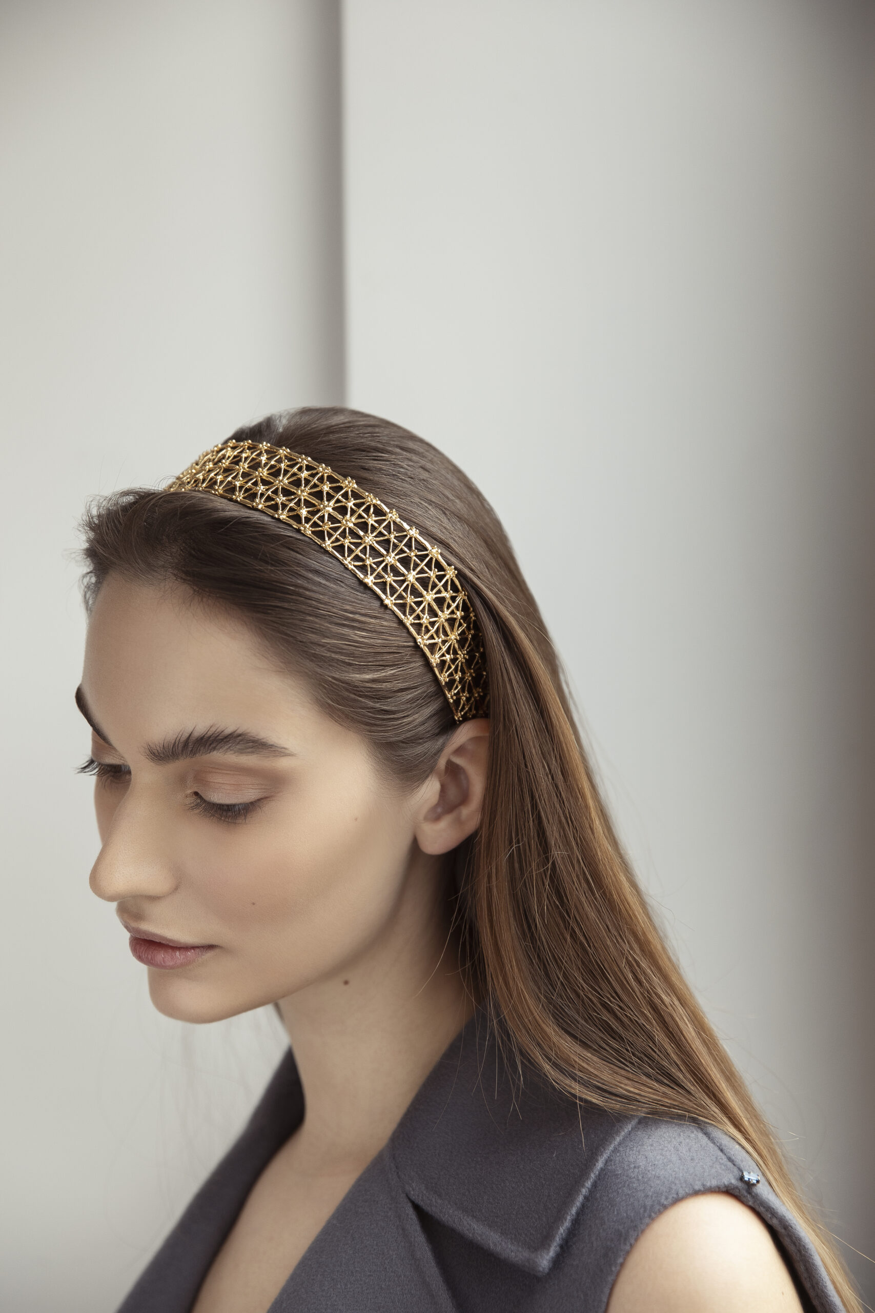 Nostalgia d’altri tempi, ruggenti visioni del futuro: le linee classiche del cerchietto in bronzo placcato oro tirano fuori l’indole romantica del Gasometro romano.