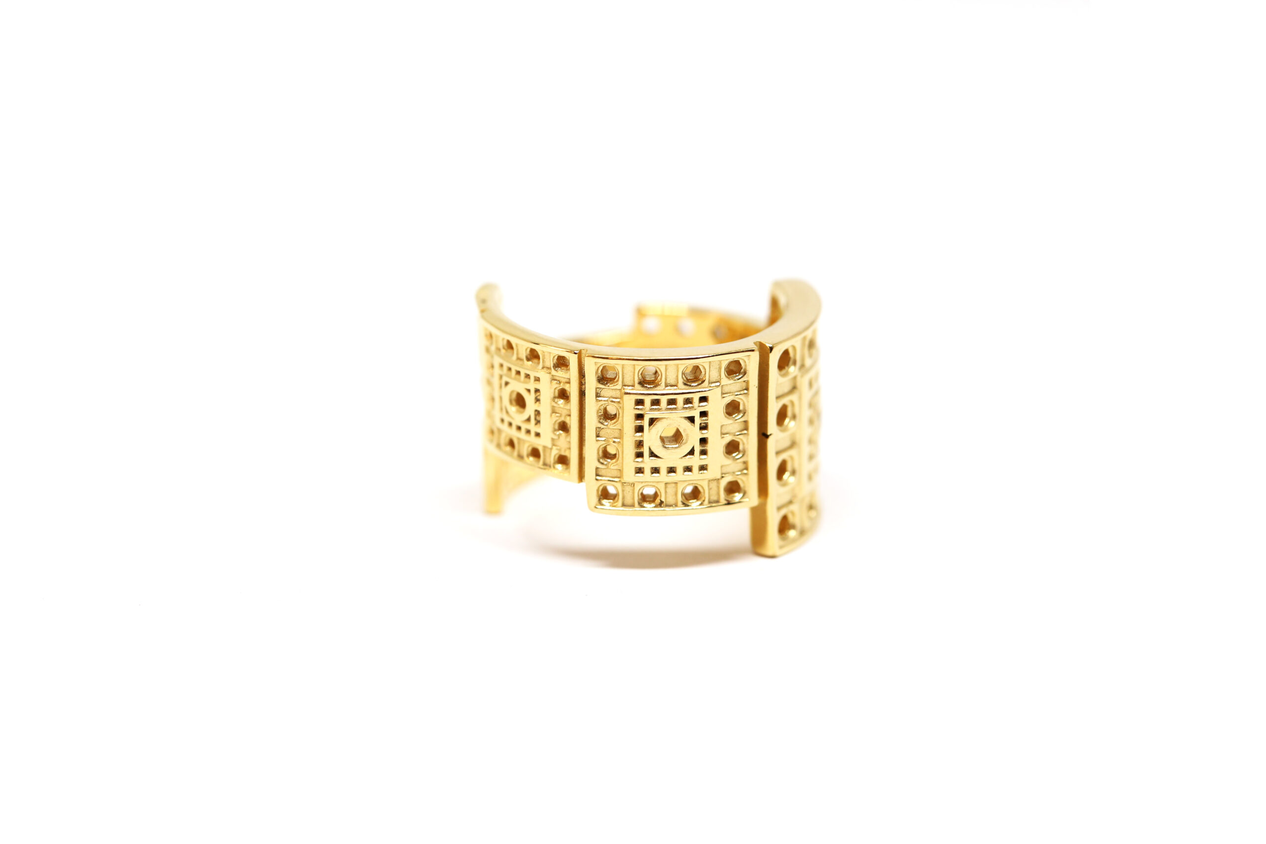 Tra luce e ombra, oriente e occidente, geometrie millenarie e simbolismi contemporanei si muove l’anello IMA ispirato alle ipnotiche suggestioni dell’Institut du Monde Arabe di Parigi. Polo culturale e massima espressione di architettura contemporanea, la sua facciata è decorata con elementi sensibili alla luce che proiettano, come il diaframma della macchina fotografica, forme mozarabiche e riflessi caleidoscopici.