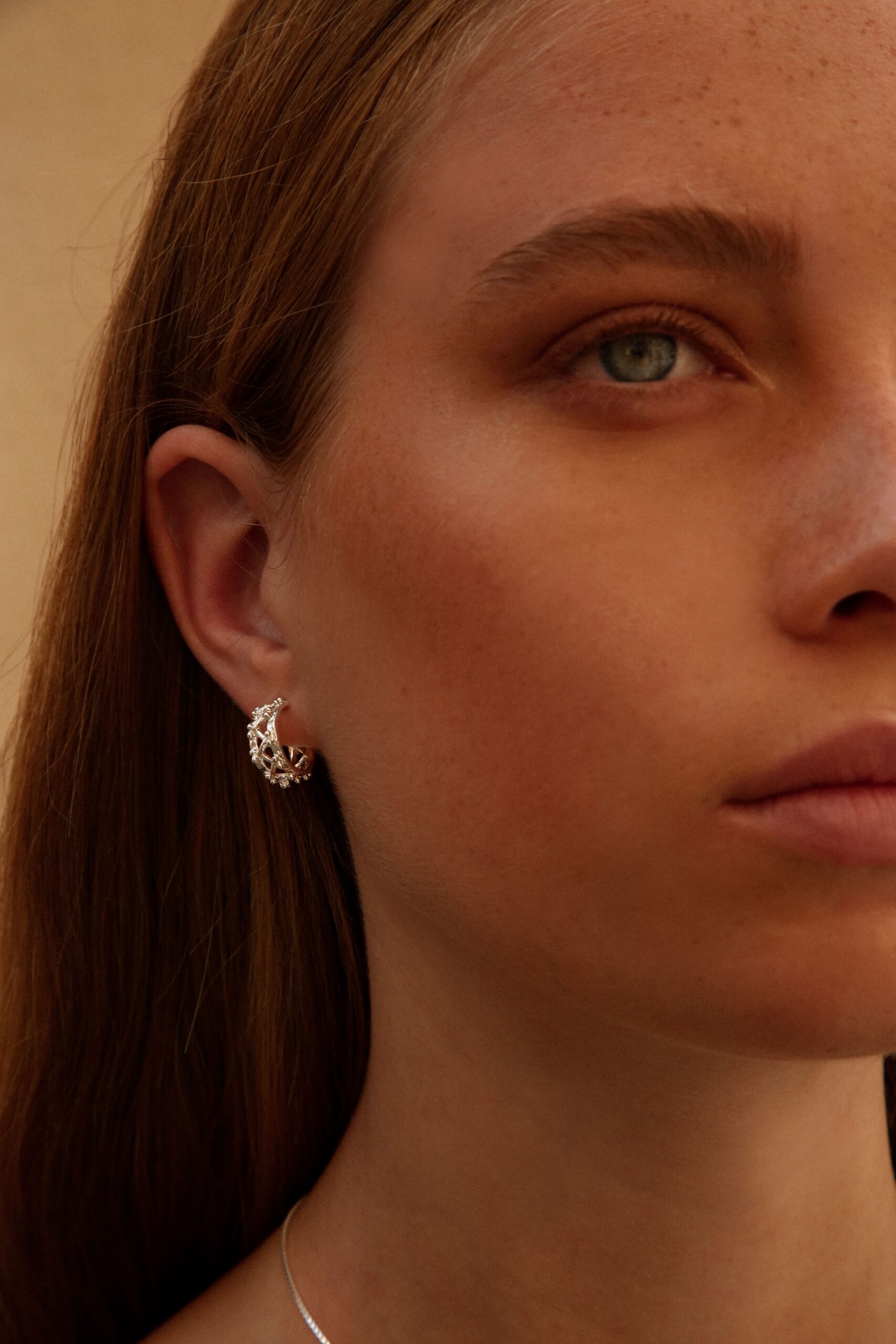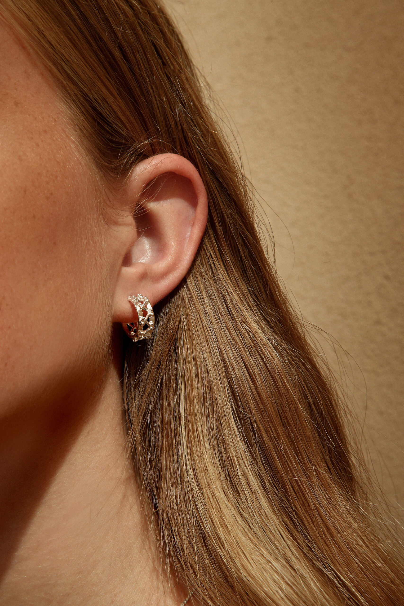 Le linee spigolose e futuristiche del carroponte si addolciscono in questi orecchini circolari placcati d’oro.