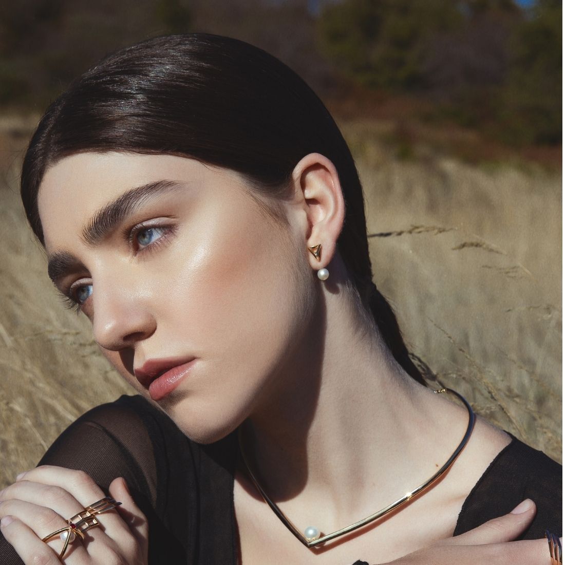 Orecchino  composto da due parti separate, il prismetto si indossa sul lobo e viene completato dalla perla che affiora da sotto.
