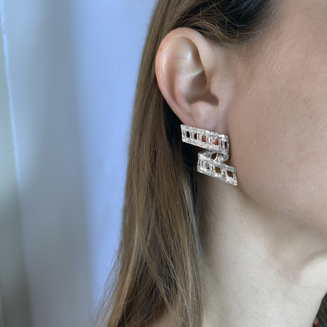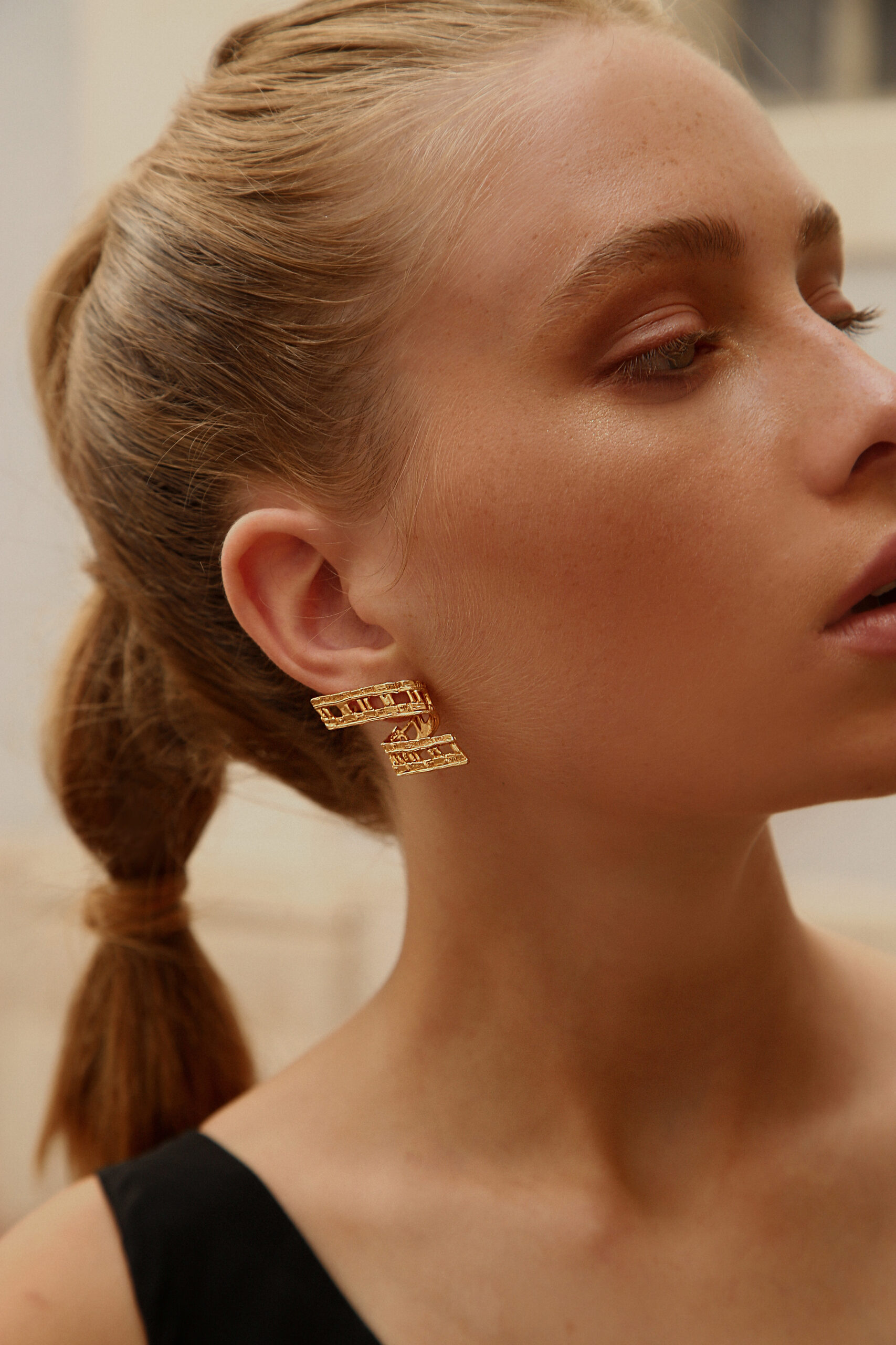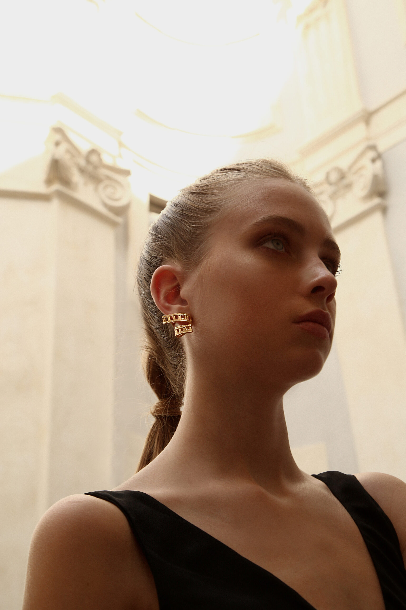 A secret kept in the Baroque depths of the city of Rome, Borromini’s spiral staircase is a dazzling example of the imaginative power of architecture. These earrings studded with details evoke its mysterious, elegant and dramatic appeal.